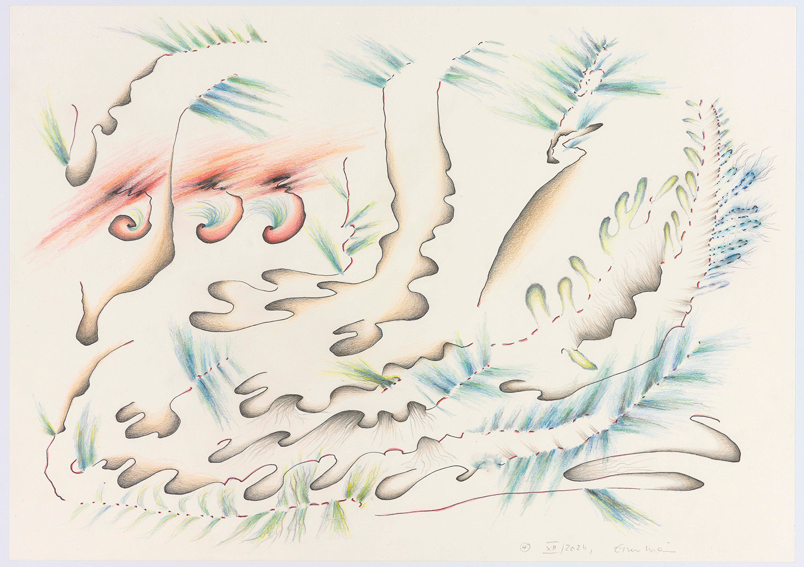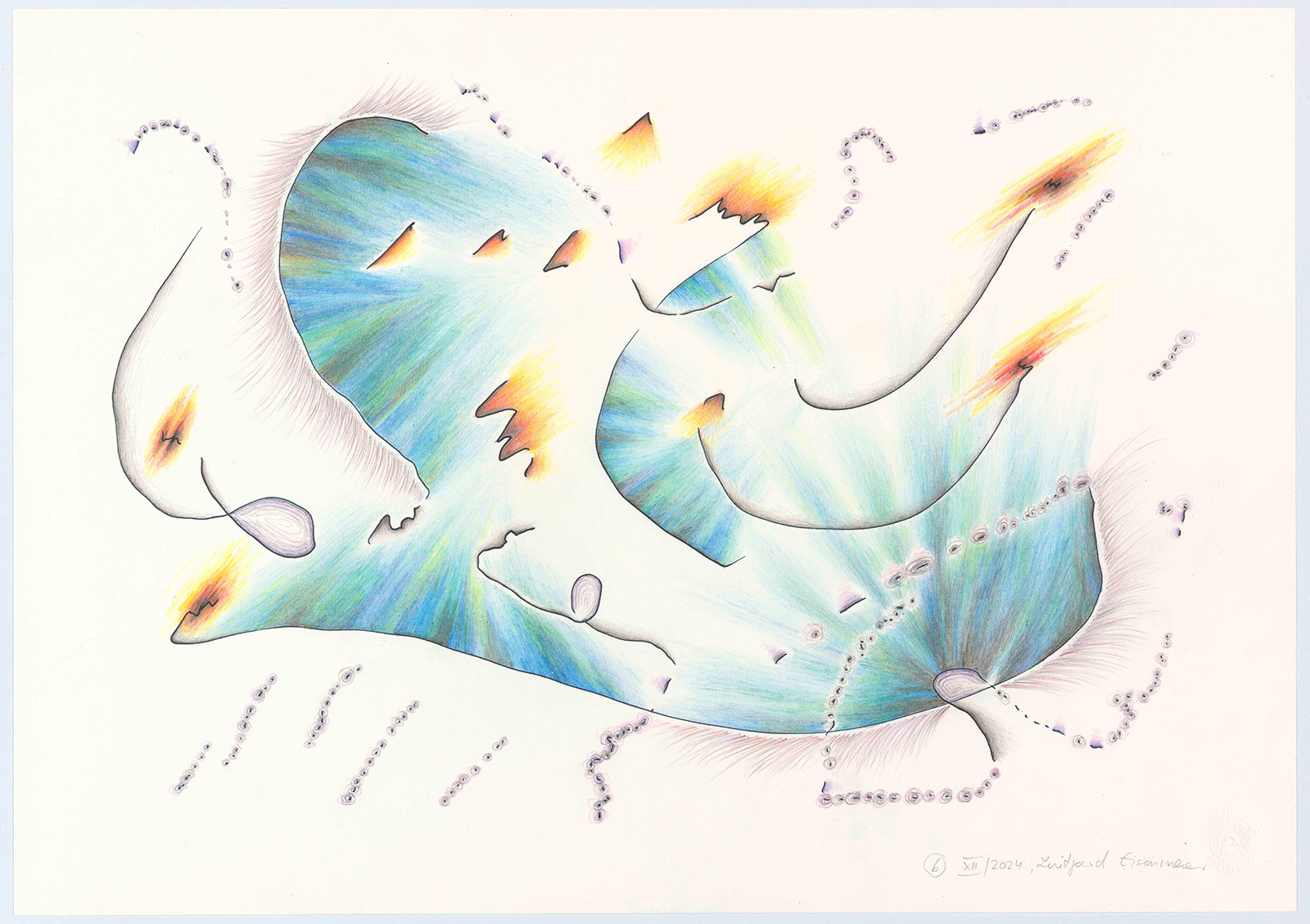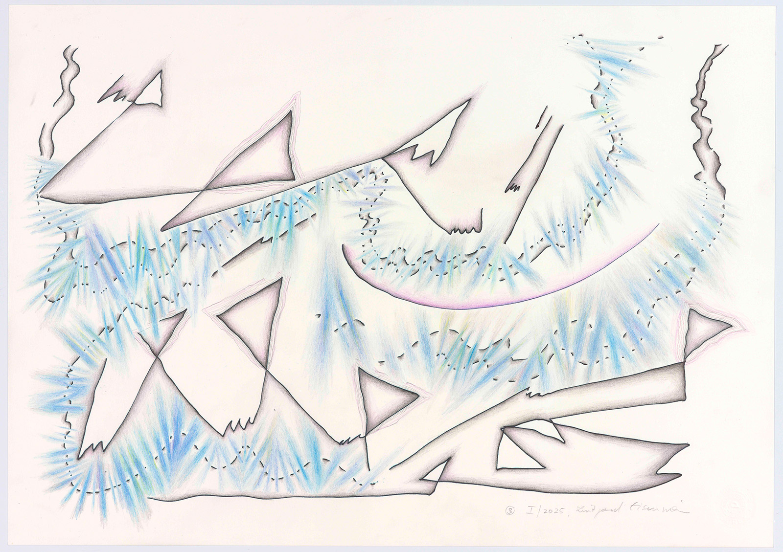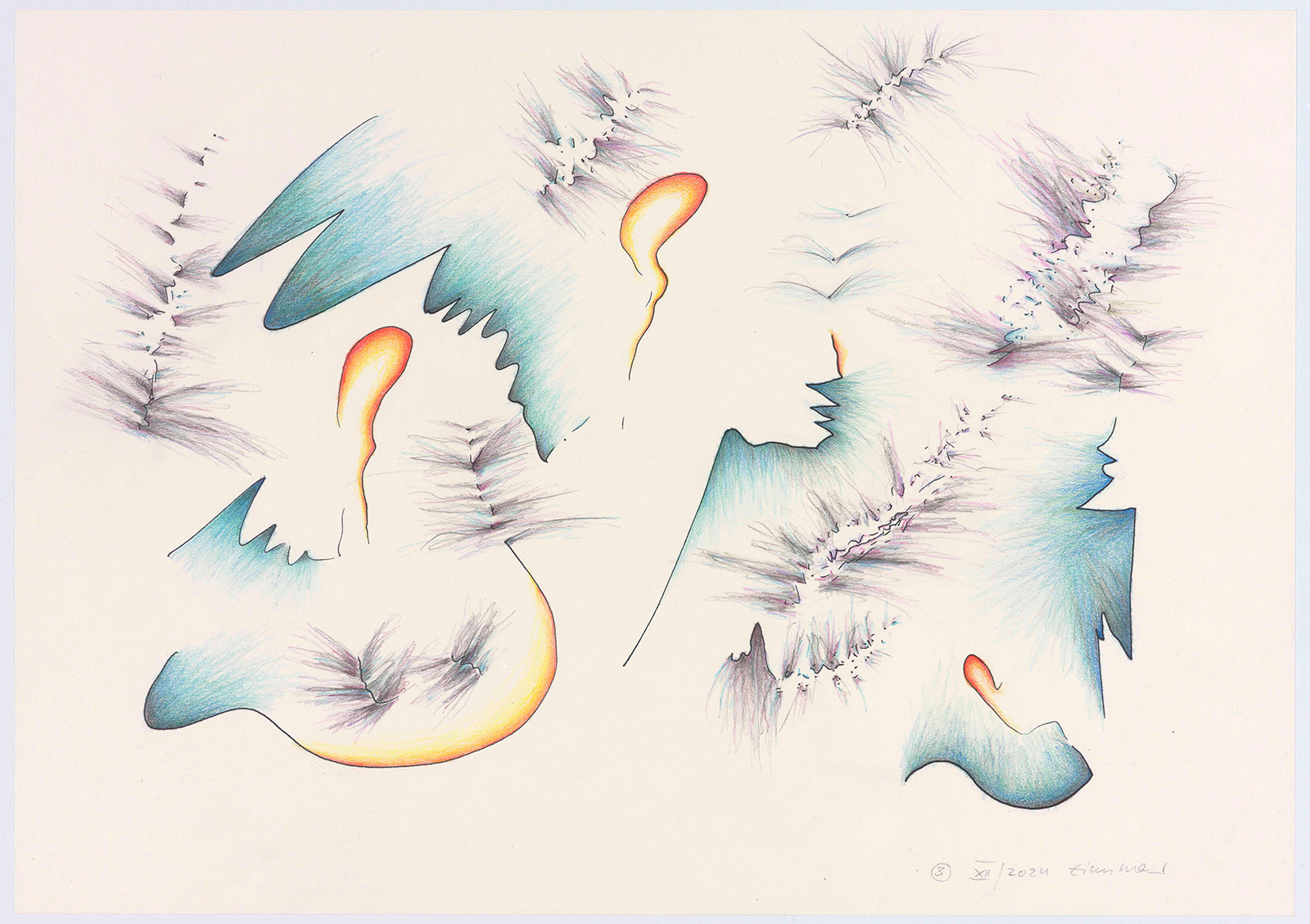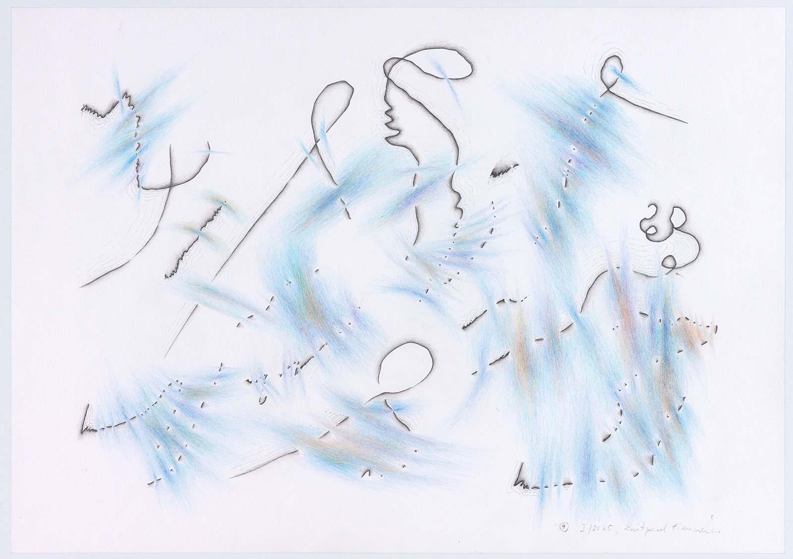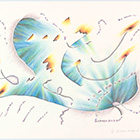 Die Grundlinien entstanden als Musikmitschriften meist beim Hören von instrumentaler Barockmusik. Ich habe dabei versucht, meinen Kopf „auszuschalten“, vor allem schnell zu sein, denn es gibt zwischen den zeichnenden Bewegungen der Hand und dem Fortgang der Musik ein massives Zeitproblem. Das schnelle Erfassen mehrstimmiger Musik bleibt fragmentarisch. In einem zweiten Schritt und viel langsamer, eher meditativ habe ich mit Buntstiften koloriert und mit Bleistift schraffiert. Formen, die die Grundlinien mir vorgaben, wurden dadurch entschieden, wild, hart, zart, wolkig, schwingend, schrill usw. zu sein. So entstanden abstrakte Zeichnungen. Die gehörte Musik ist nun „verloren“.