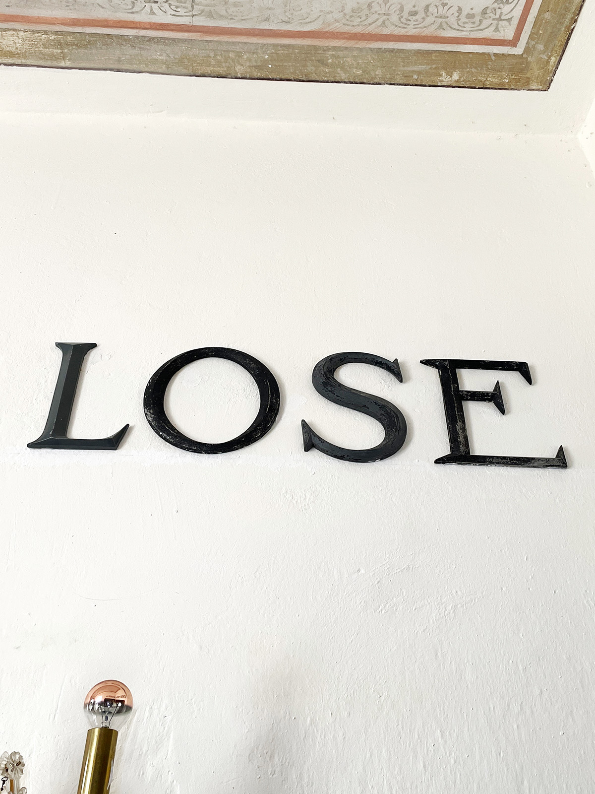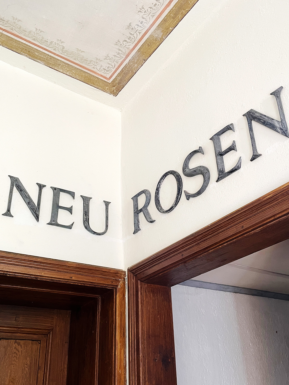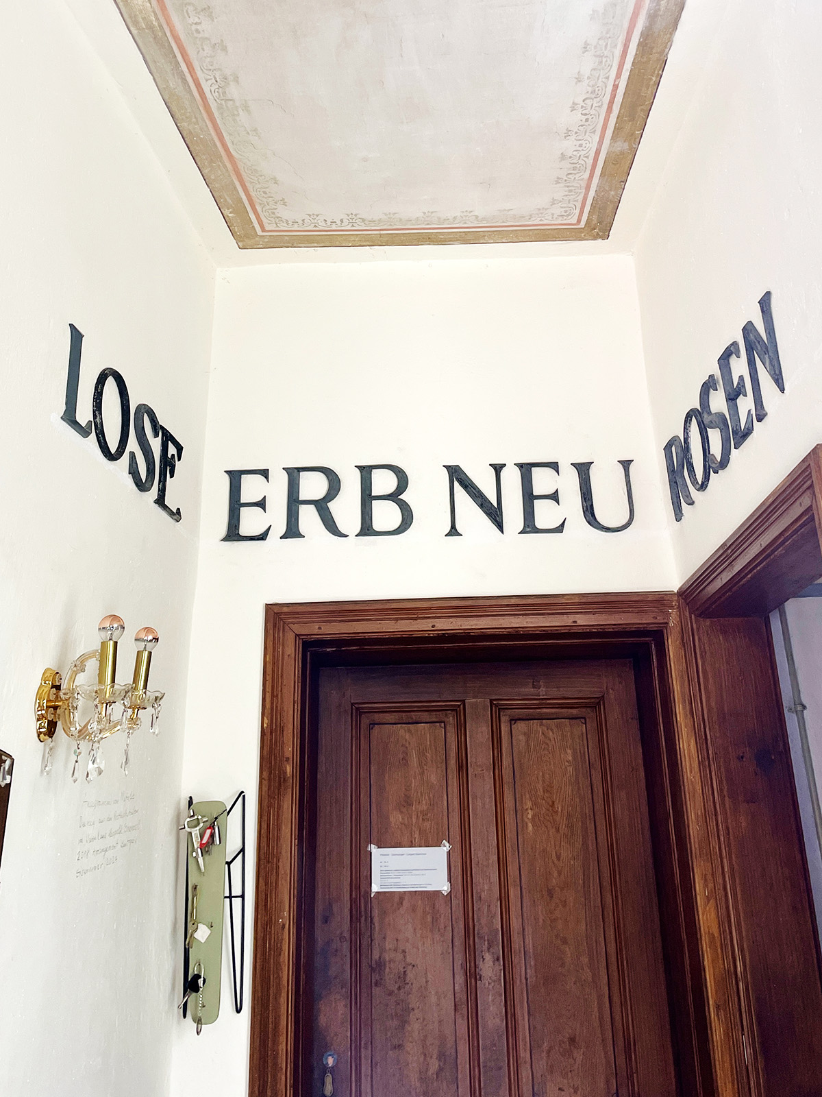 Nach der Transformation des „Warenhaus Leopold Breinessl“ ins Palais Wild blieben Restbuchstaben. Natalie Deewan kreierte daraus dieses Anagramm. 2024 fand Luitgard Eisenmeier endlich einen würdigen Platz und montierte es. LOSE ERB NEU ROSEN ist nun Teil des Hauses. Das Anagramm steht sowohl dem Haus wie unserer Familie.