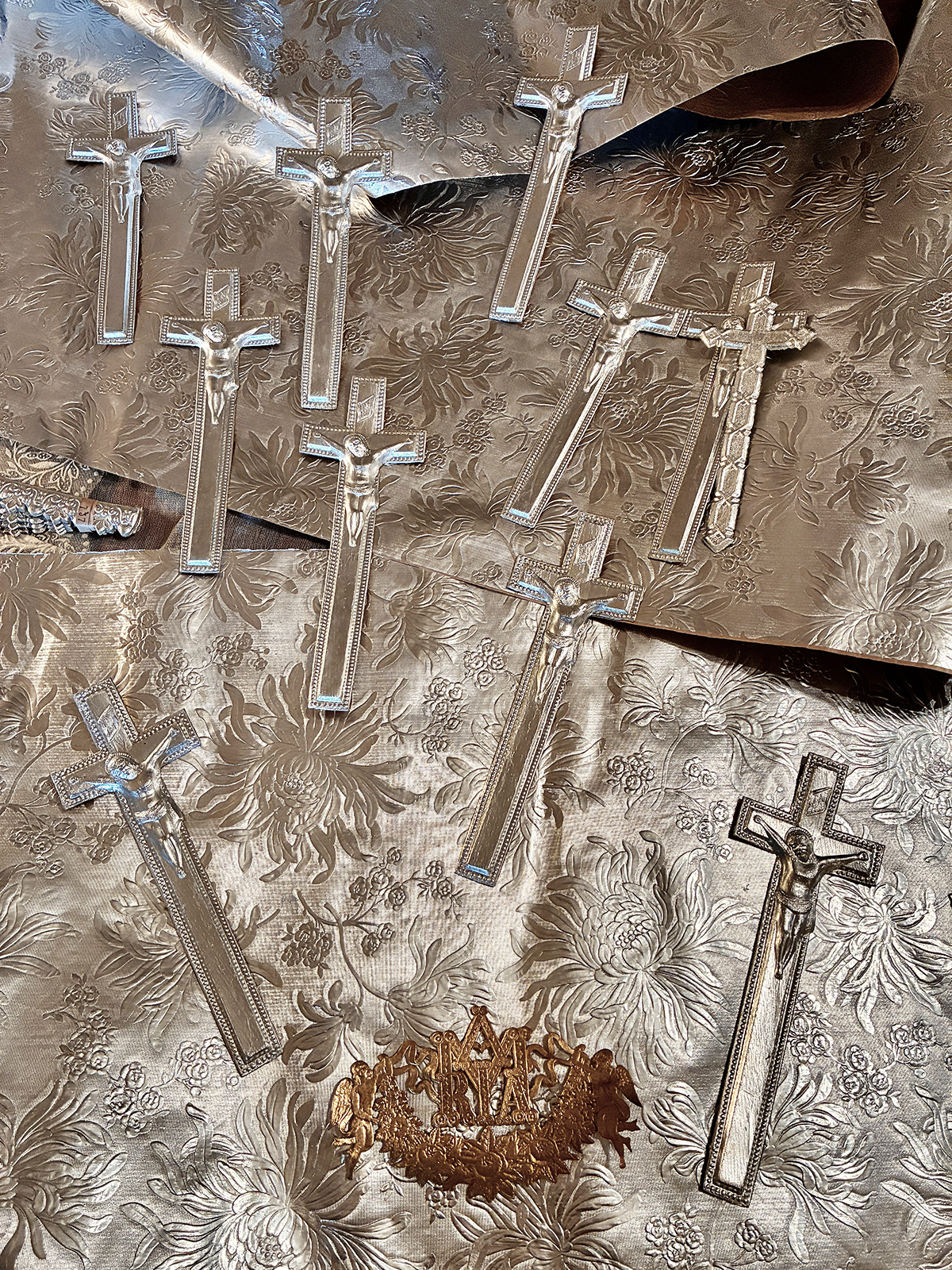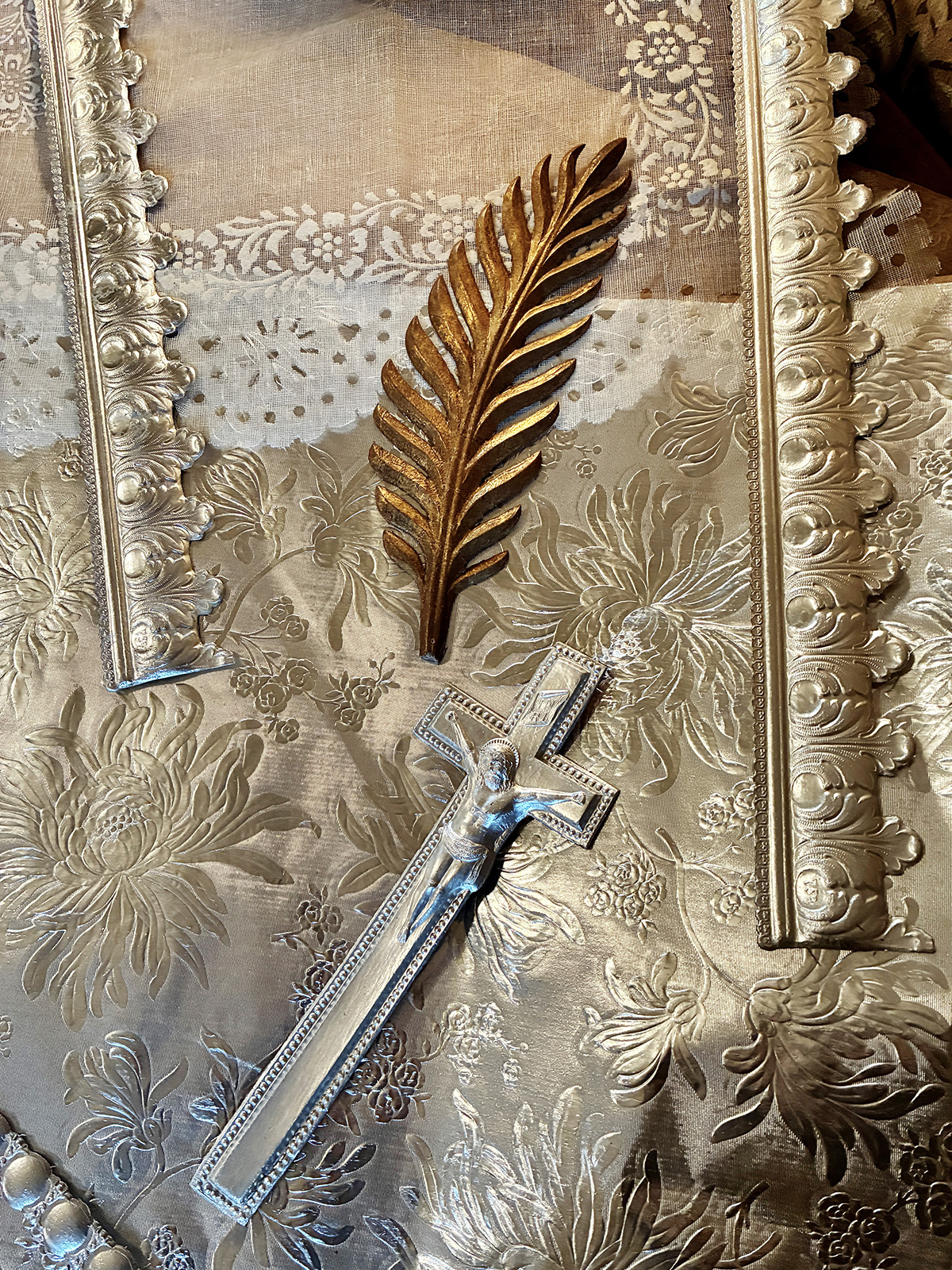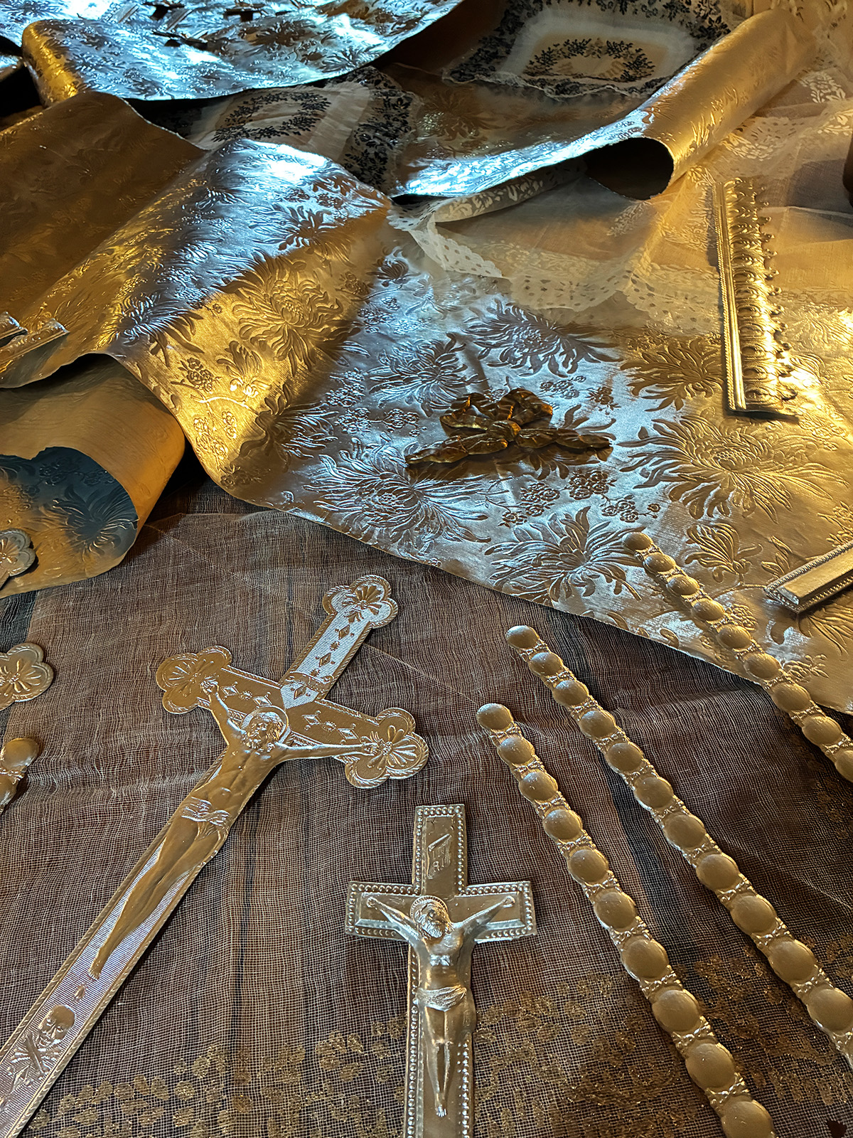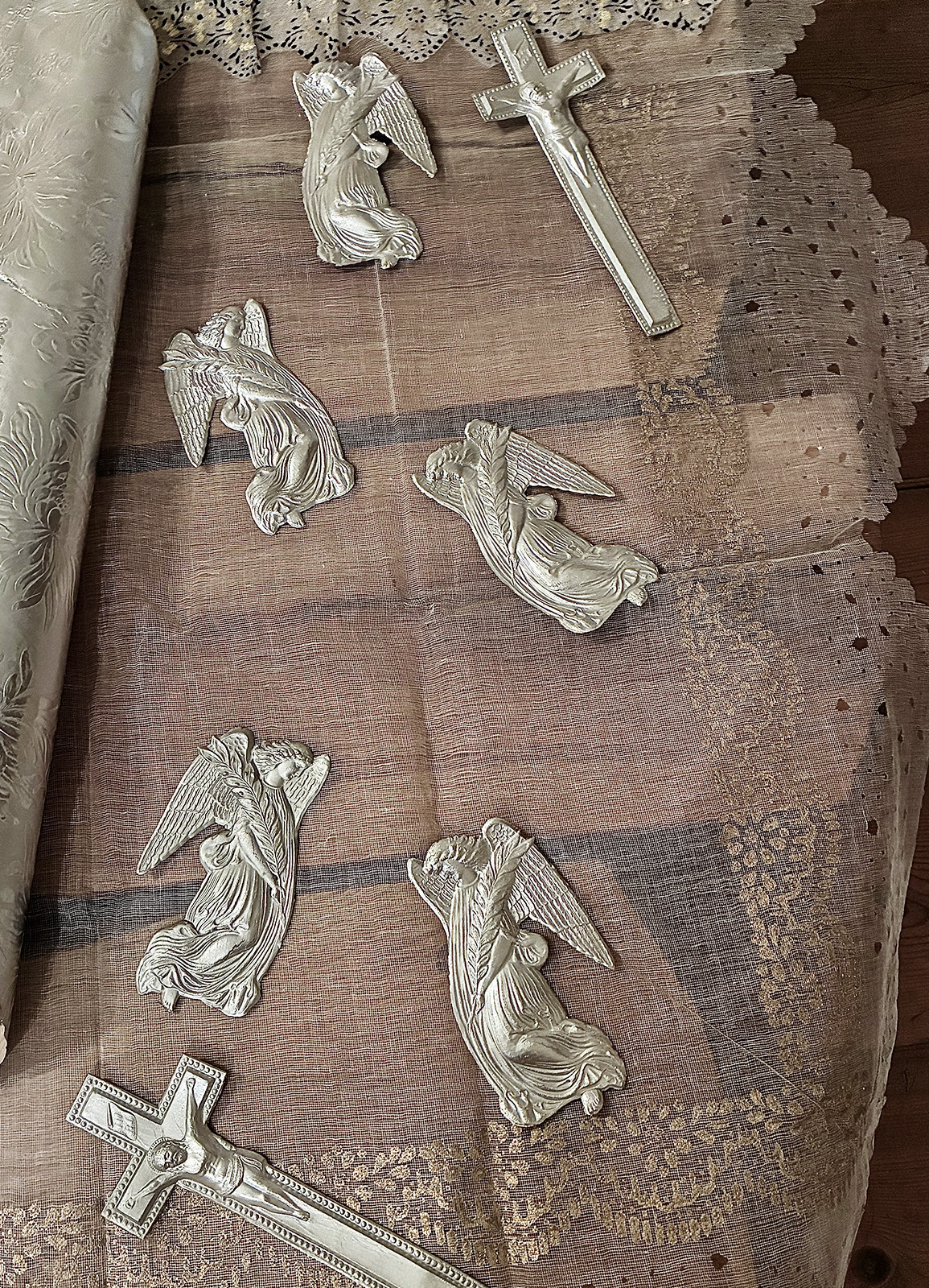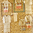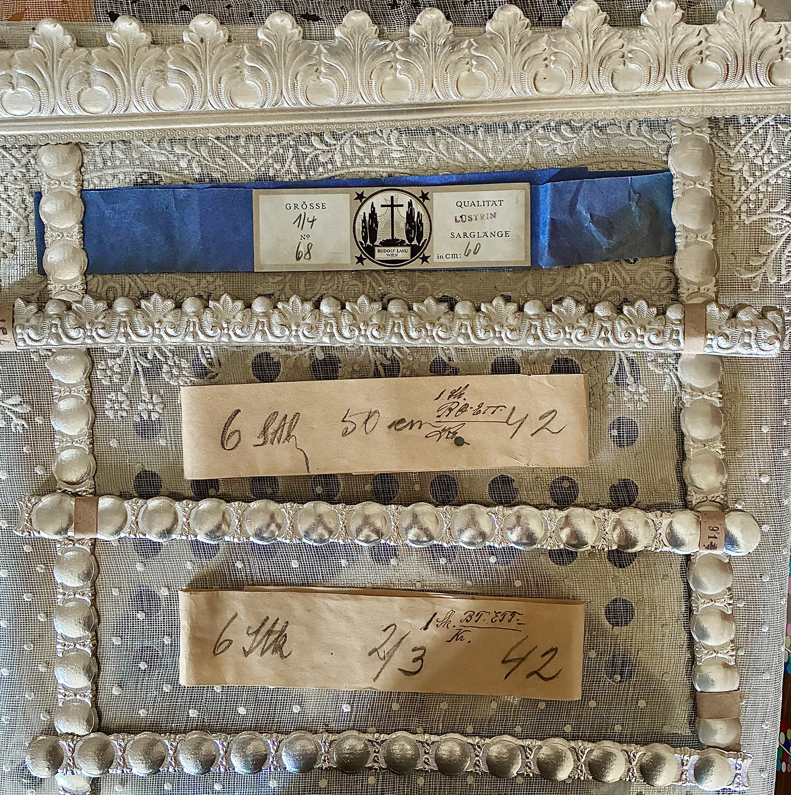 Totenzimmer: Särge und Leichen auszustatten ist eine Geschäftstätigkeit. Kindertotenhemden und Sargschmuck aus geprägtem Karton, Papier und Textil, 1910er Jahre - gerettete Fundstücke des ehemaligen Warenhauses. (!einmalig in Europa!)
