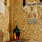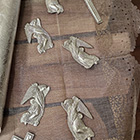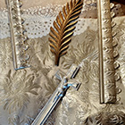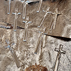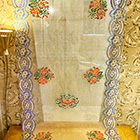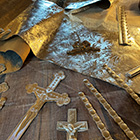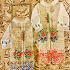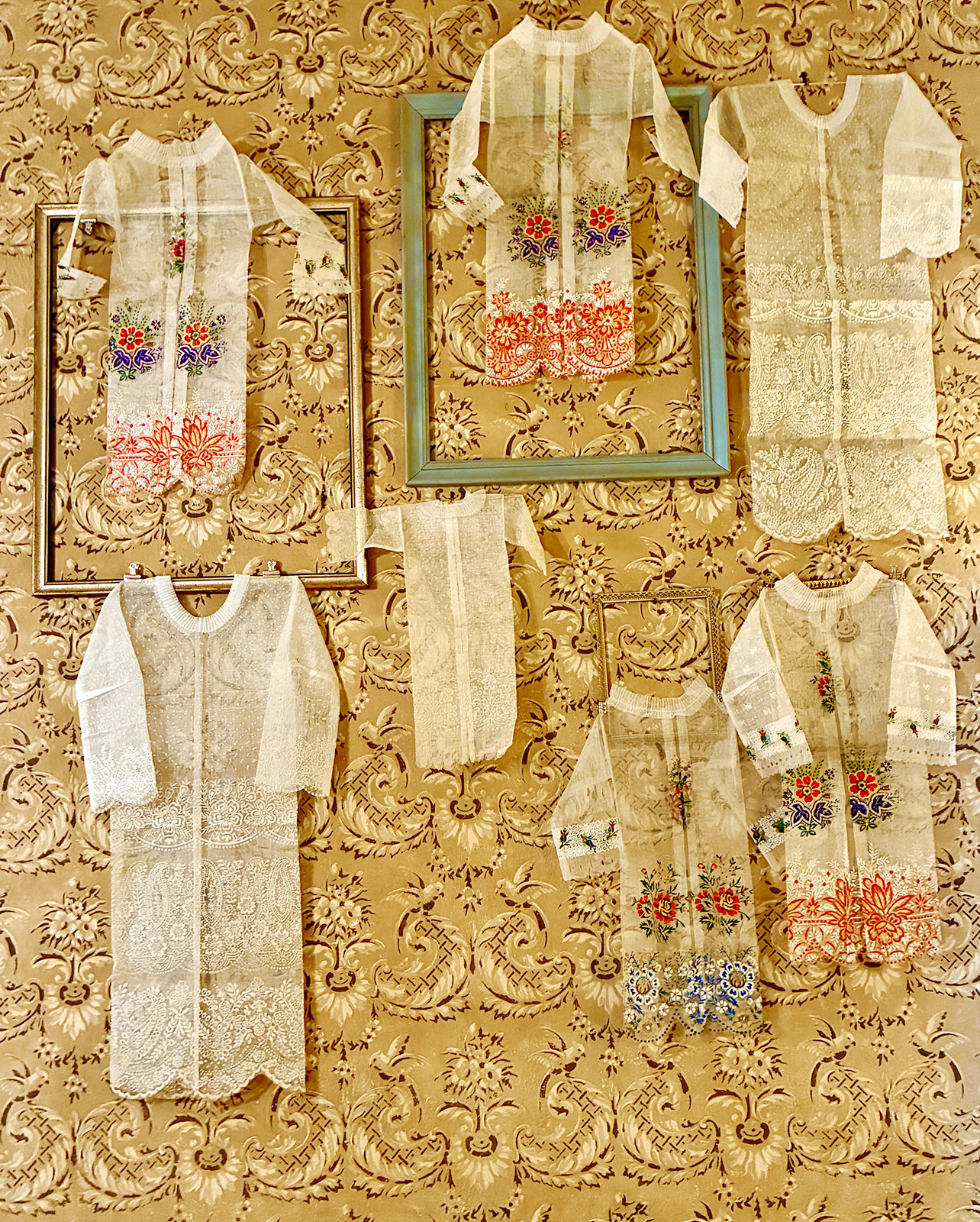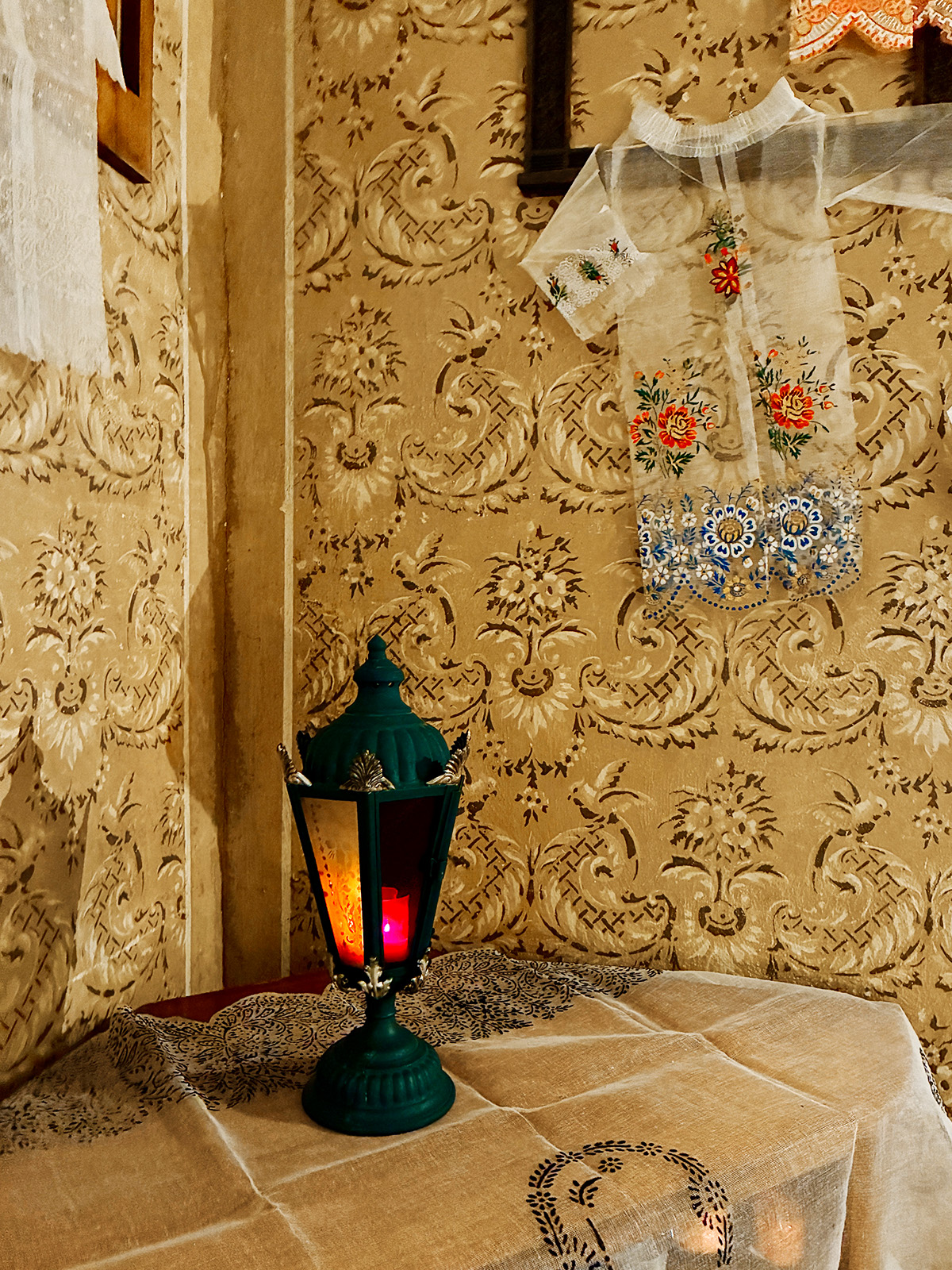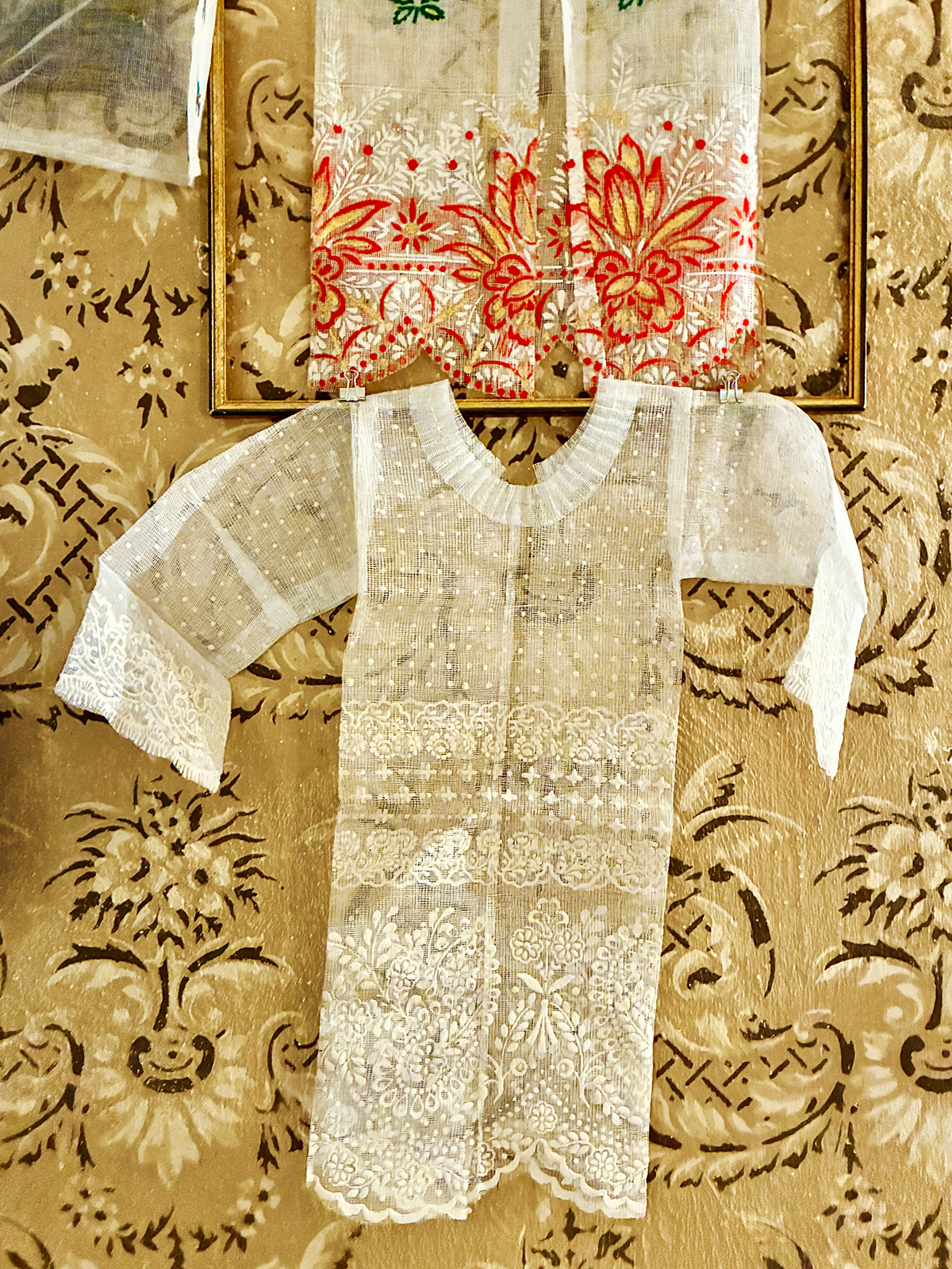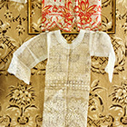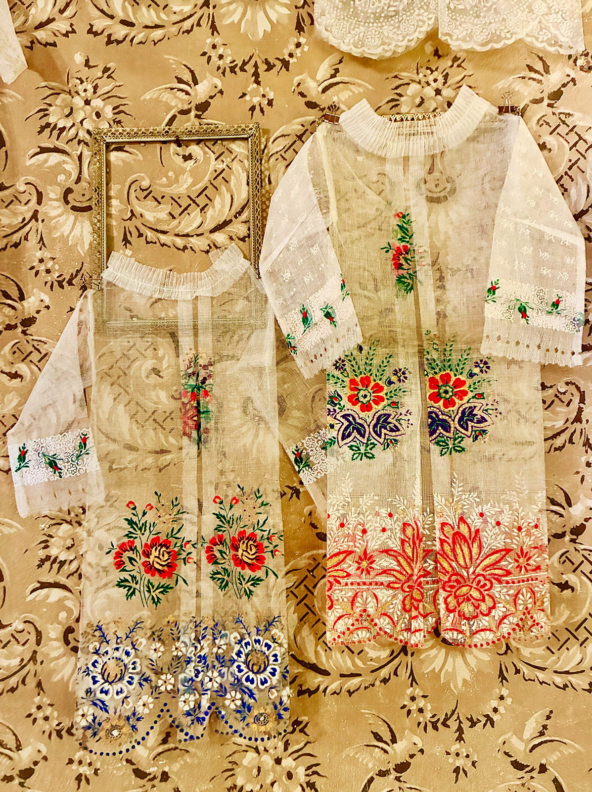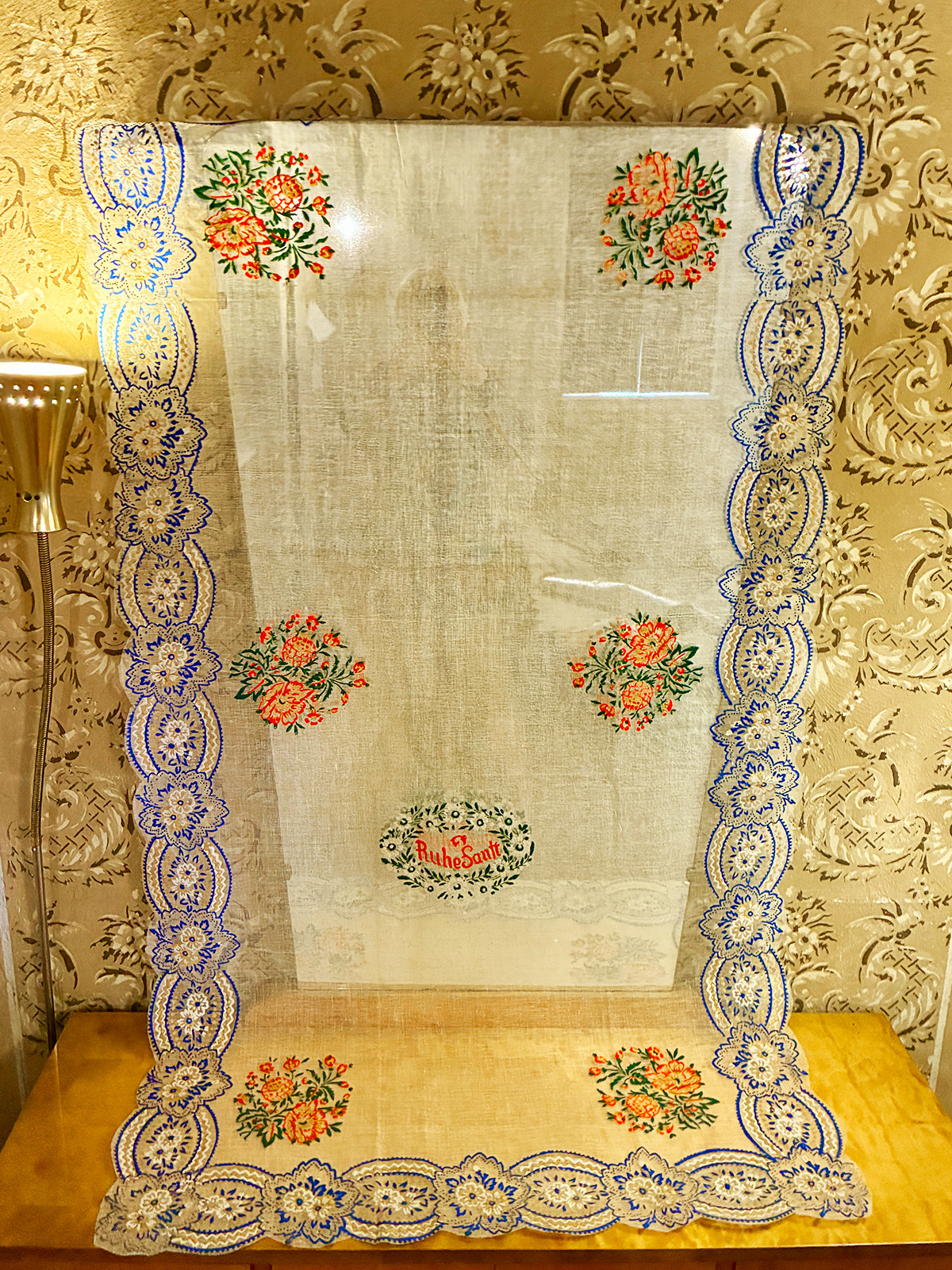 Totenzimmer: Särge und Leichen auszustatten ist eine Geschäftstätigkeit. Kindertotenhemden und Sargschmuck aus geprägtem Karton, Papier und Textil, 1910er Jahre - gerettete Fundstücke des ehemaligen Warenhauses. (!einmalig in Europa!)