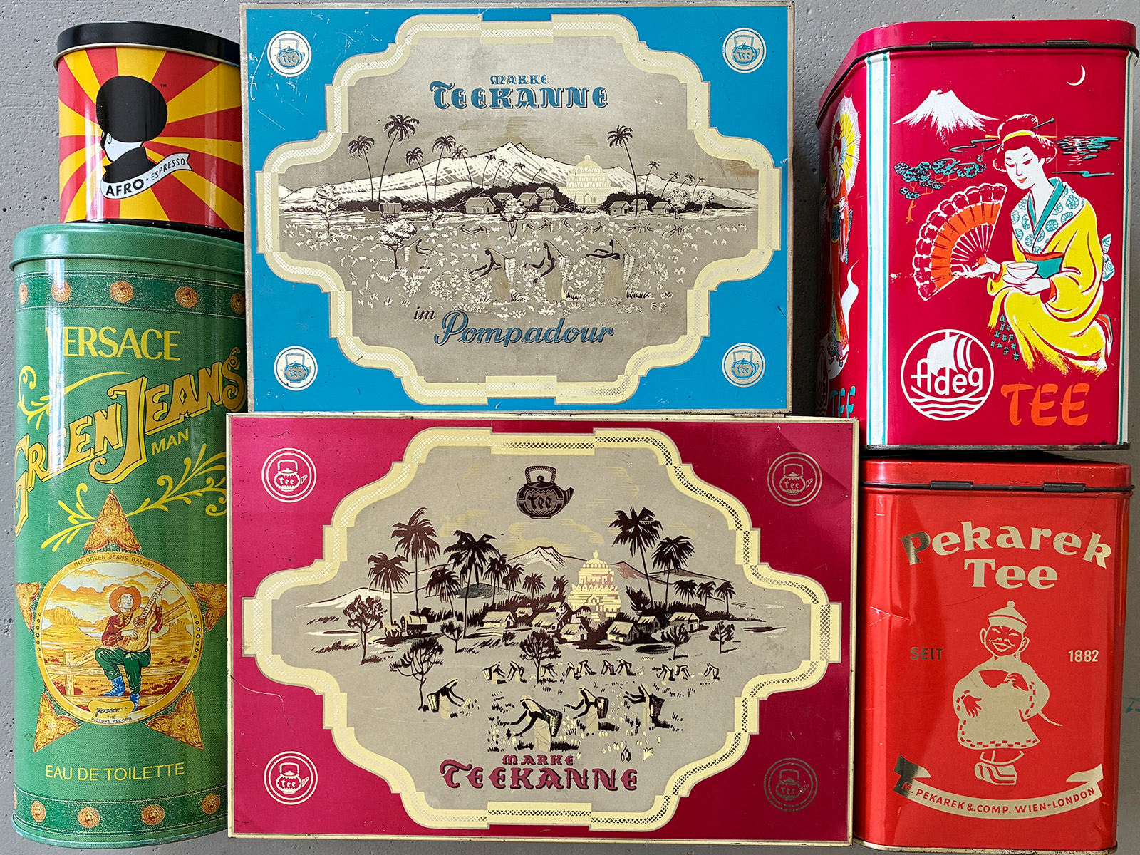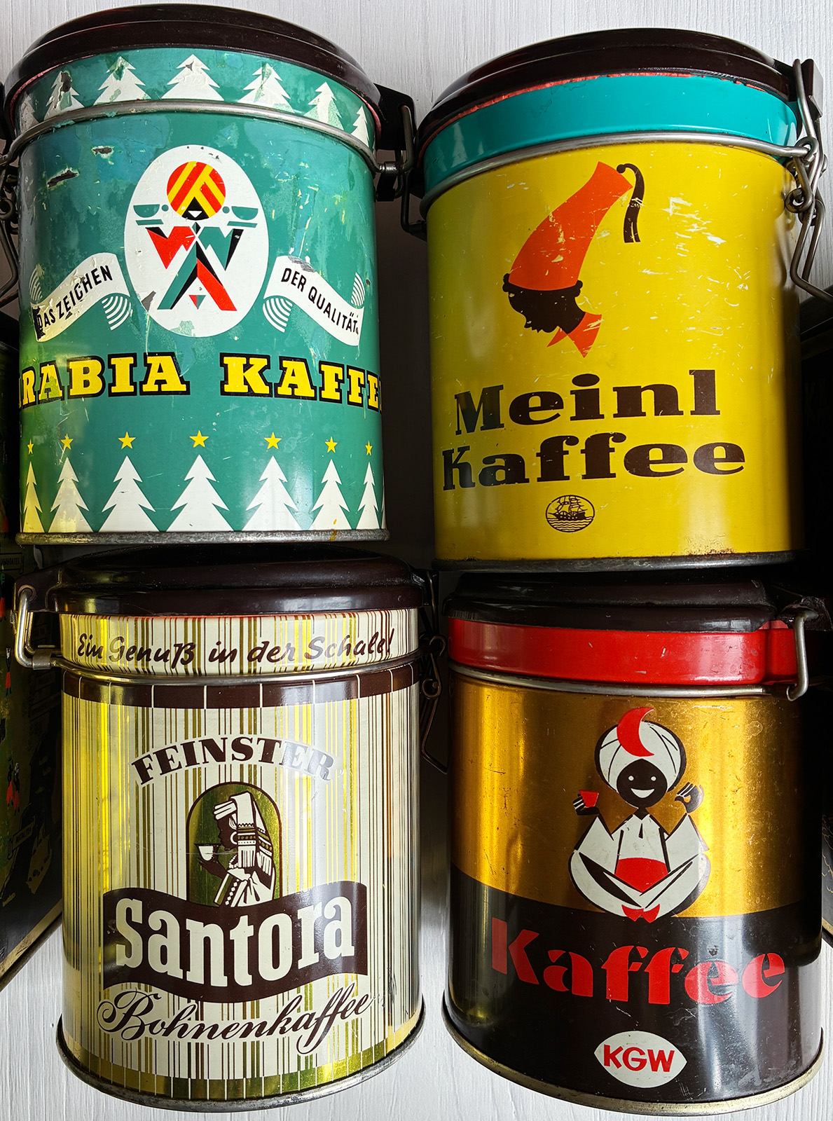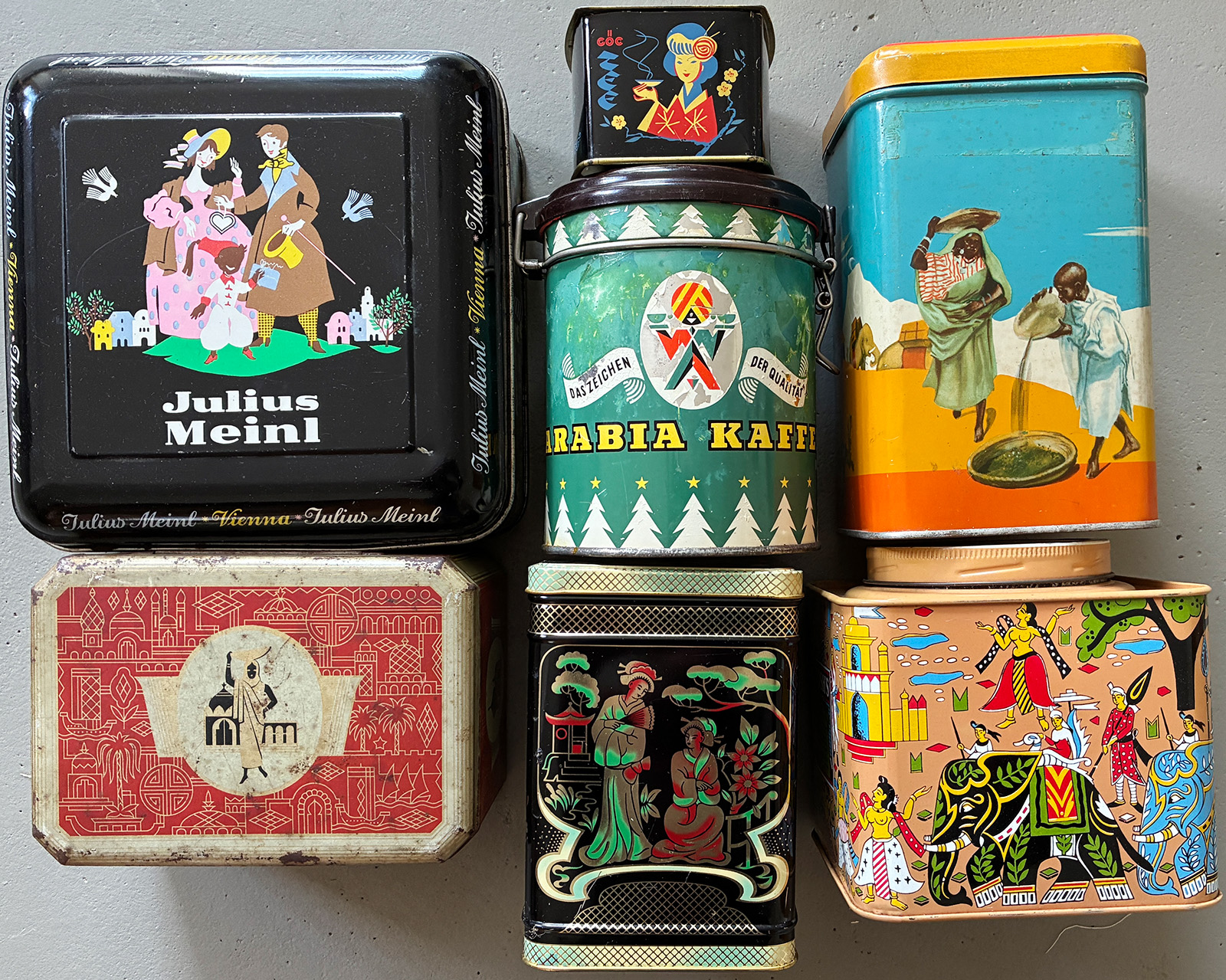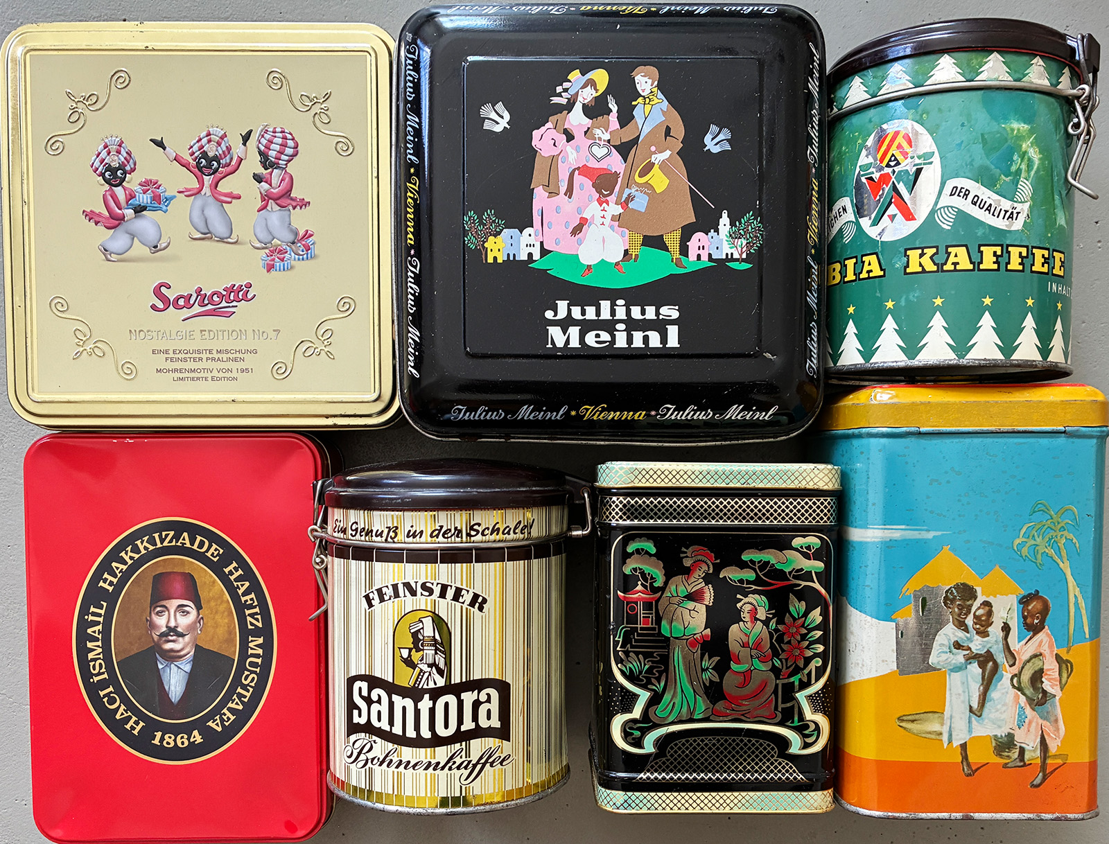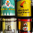 Dosen: Gestaltung von Verpackung ist bis heute marktrelevant und dient dem Kaufanreiz = Stimulation, Verführung, Suggestion. Auf den Dosen sind Menschen stereotypisch meist im Sinne der einstigen „Kolonialwaren“ abgebildet. Zugleich erzählen sie Geschichten aus fernen Ländern und ferner Vergangenheit.