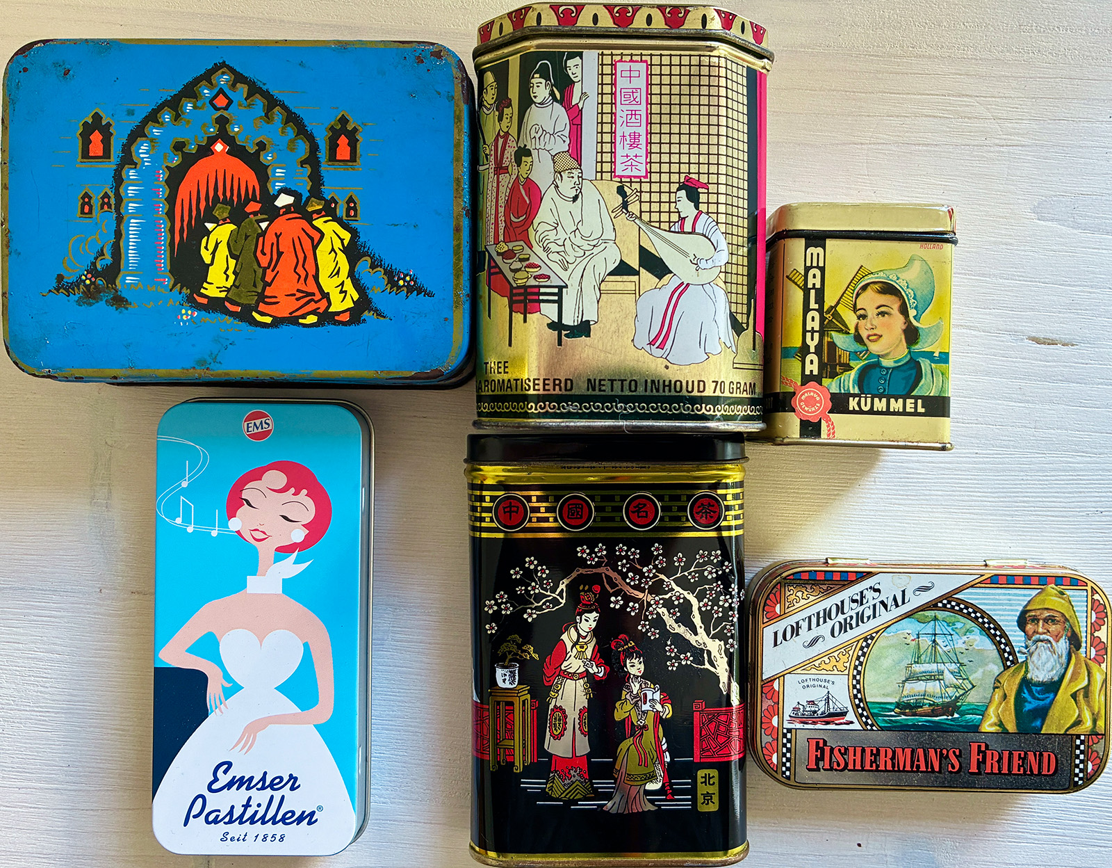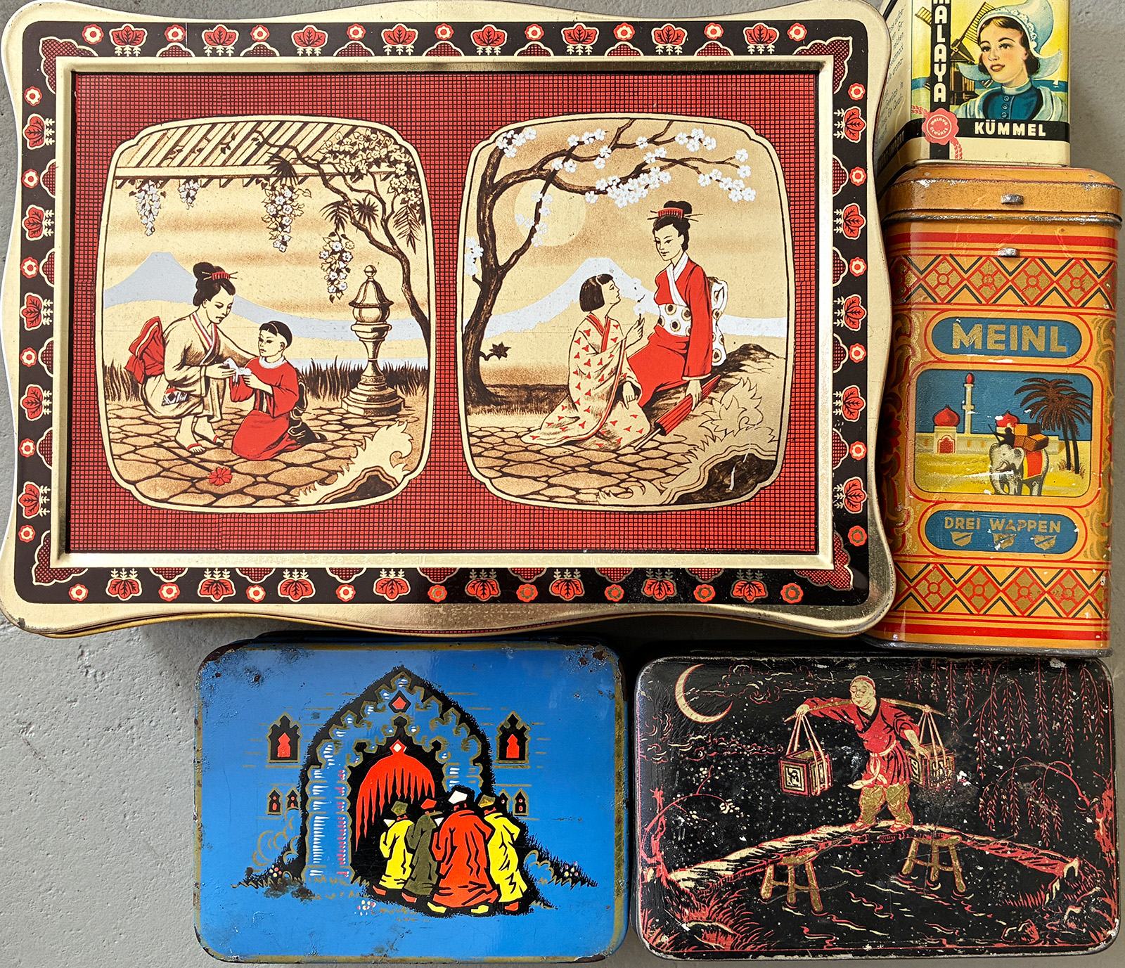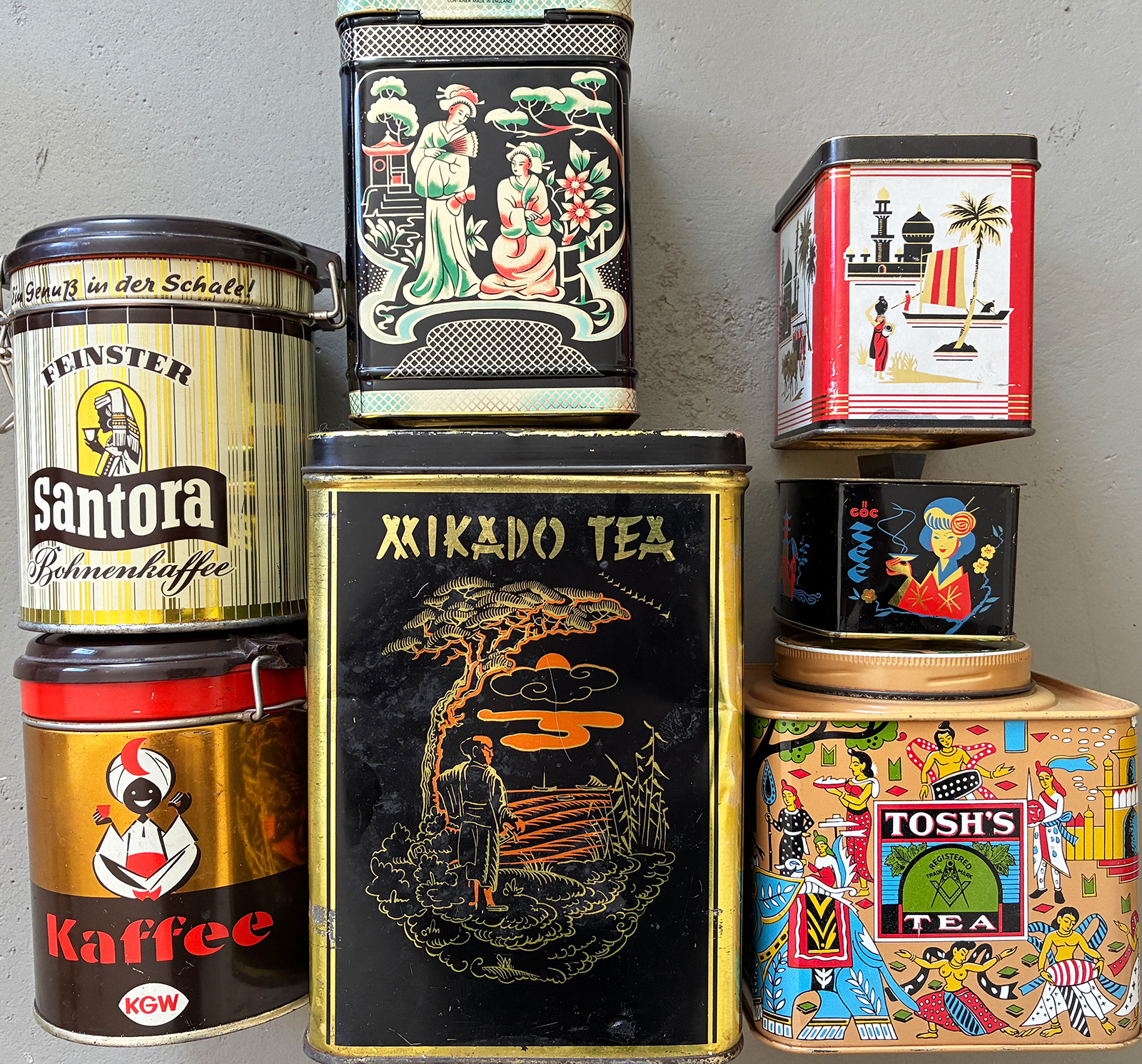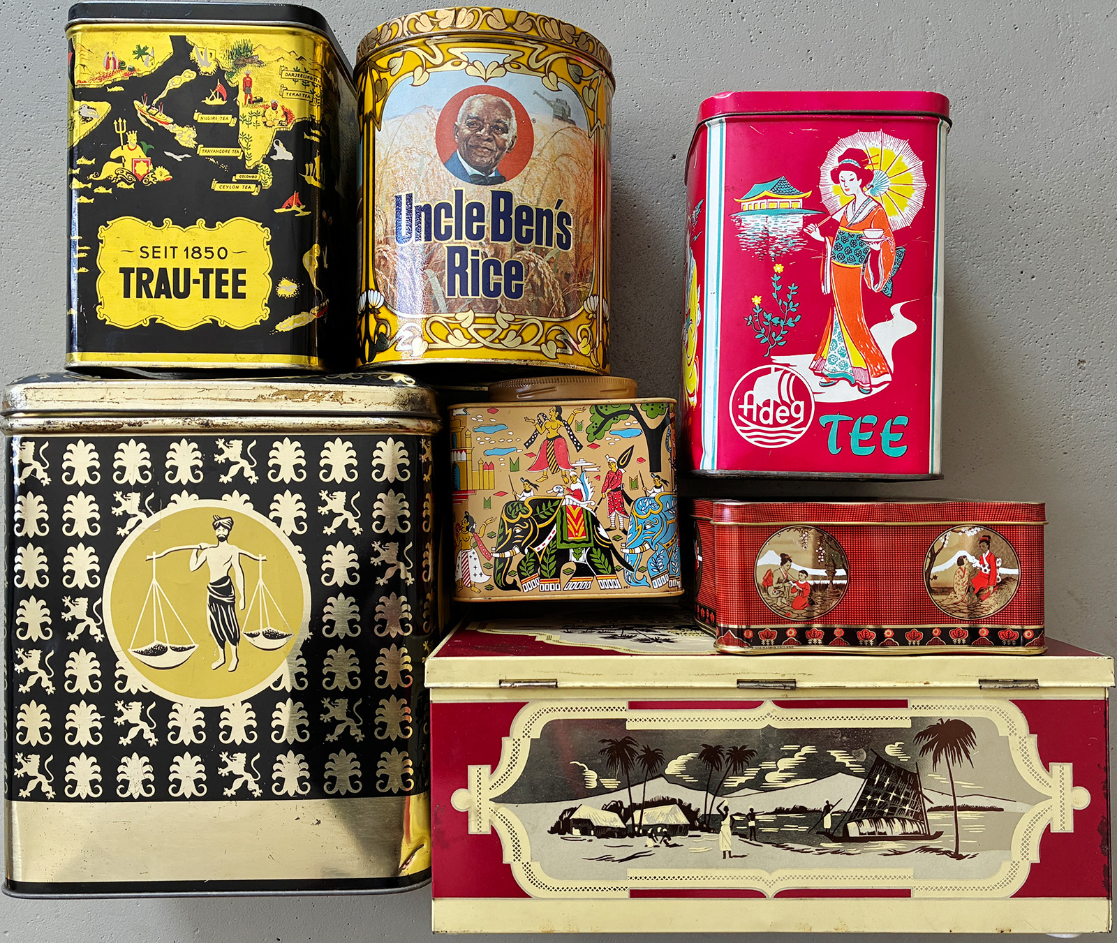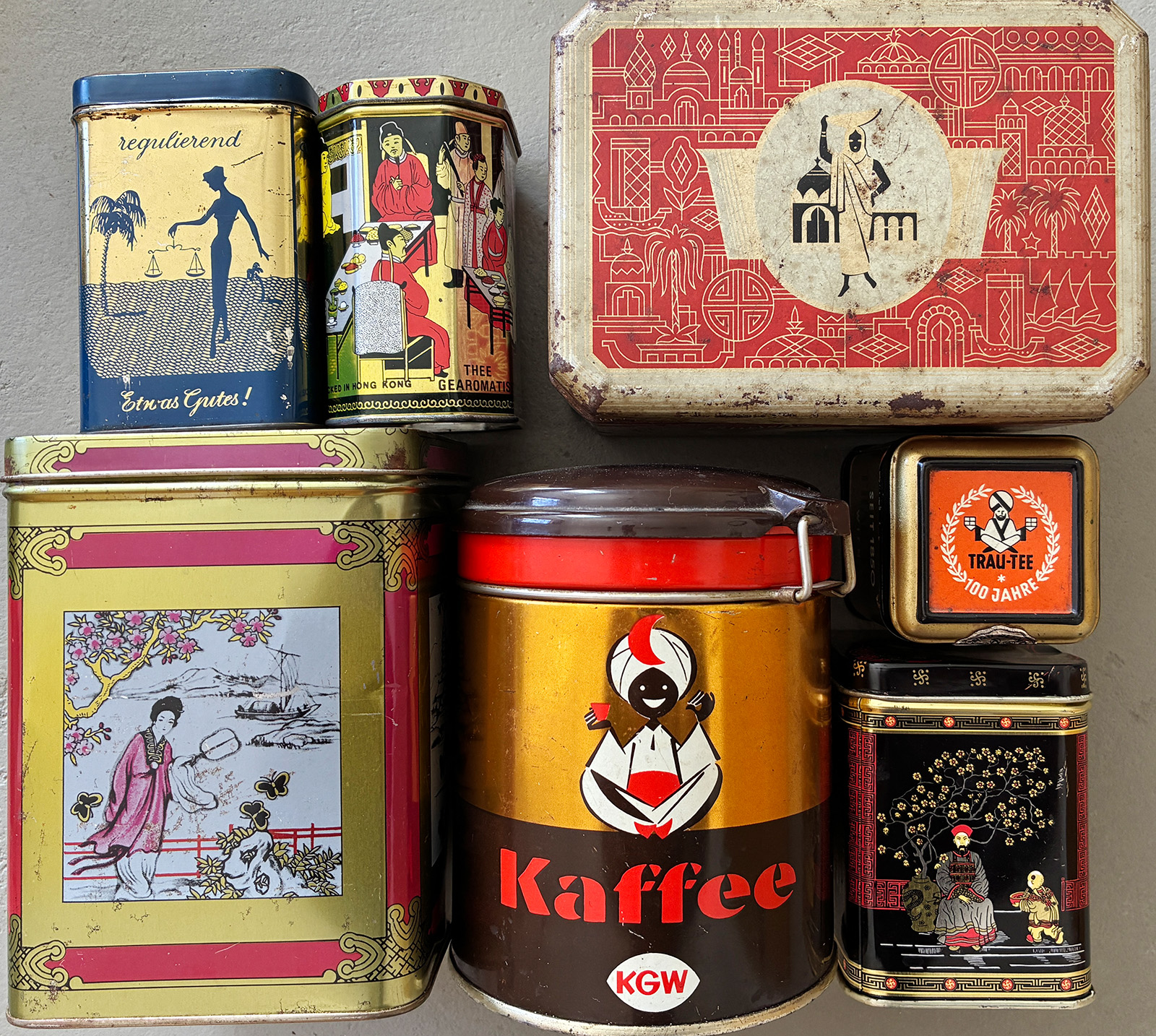 Dosen: Gestaltung von Verpackung ist bis heute marktrelevant und dient dem Kaufanreiz = Stimulation, Verführung, Suggestion. Auf den Dosen sind Menschen stereotypisch meist im Sinne der einstigen „Kolonialwaren“ abgebildet. Zugleich erzählen sie Geschichten aus fernen Ländern und ferner Vergangenheit.